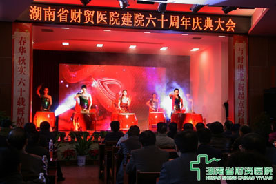 12月1日,湖南省财贸医院迎来60华诞,上午9时28分庆典大会在医院六楼礼堂隆重举行。全国政协委员、省政协副主席龚建明、省财政厅副厅长郭金洲、省卫生厅副厅长方亦兵,省供销社领导陈德礼、柳才春、刘荣宗、熊小兰、彭海华、杨利凯、欧程远,国内外、省内外知名20余名专家教授、市卫生局副局长黄赣湘、区卫生局党委书记阎伟奇等出席了大会,长沙市医院协会和兄弟医院、省社直属17家单位相关领导和社会各界朋友等100多人到会祝贺,湖南经视、湖南都市、长沙电视台、湖南日报、长沙晚报、潇湘晨报、湖南红网、湖南在线等八家媒体进行了相关报道。